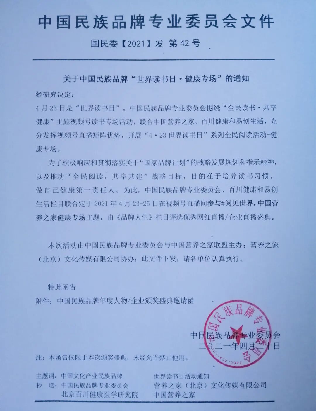 4月23日是“世界读书日”。中国民族品牌专业委员会围绕“全民读书·共享健康”主题视频号读书专场活动,联合中国营养之家、百川健康和易创生活,充分发挥视频号直播矩阵优势,开展“4·23世界读书日”系列全民阅读活动-健康专场。